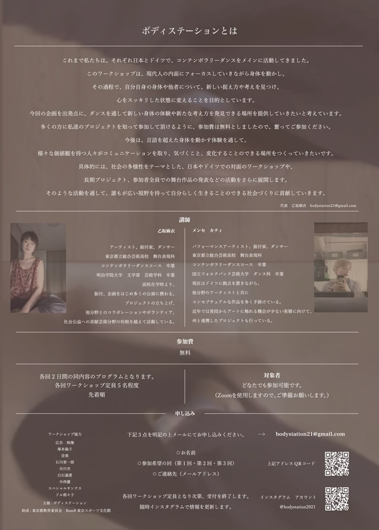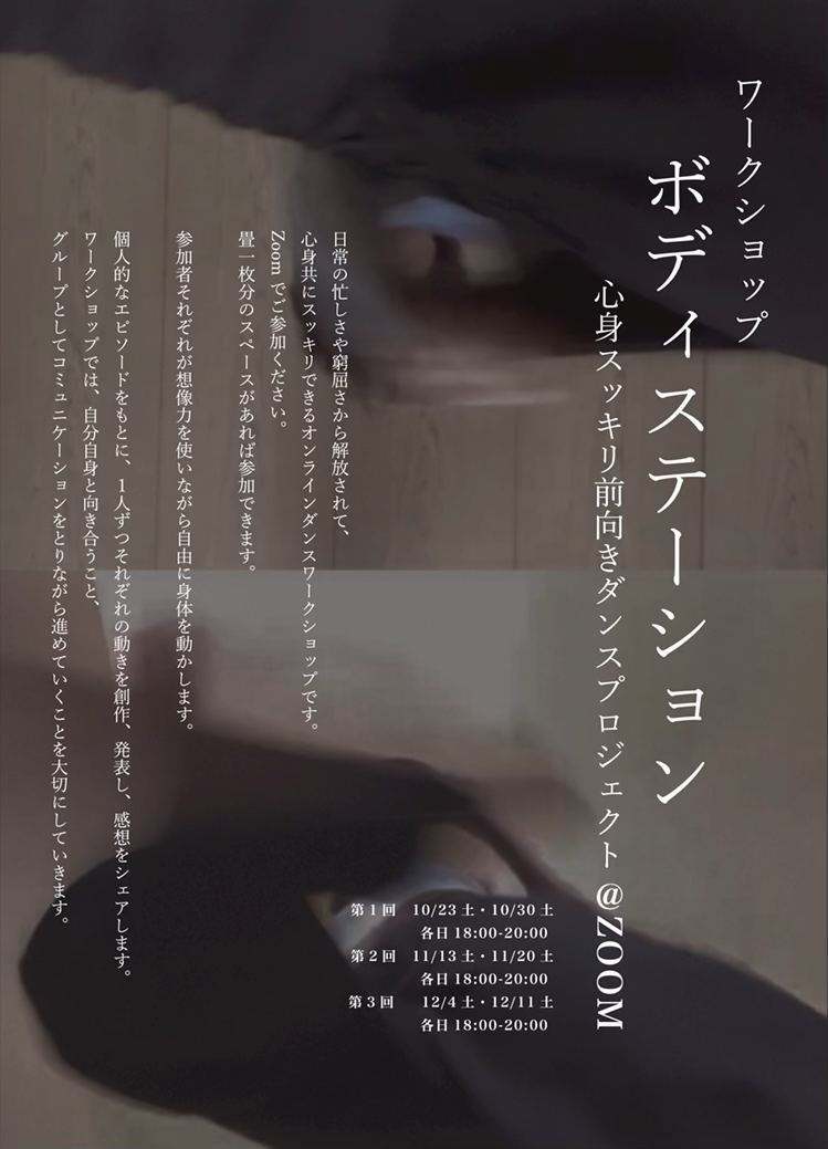ワークショップでは、現代人の内面にフォーカスしていきながら身体を動かし、その過程で、自分自身の身体や他者について、新しい捉え方や考えを見つけ、心をスッキリした状態に変えることを目的としている。この企画を出発点に、ダンスを通して新しい身体の体験や新たな考え方を発見できる場所を提供していきたい。