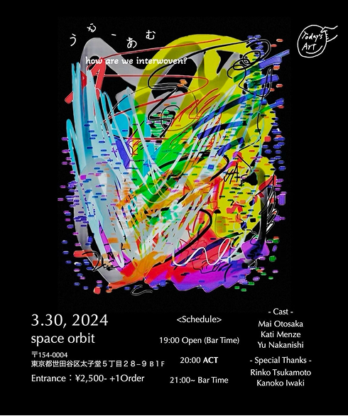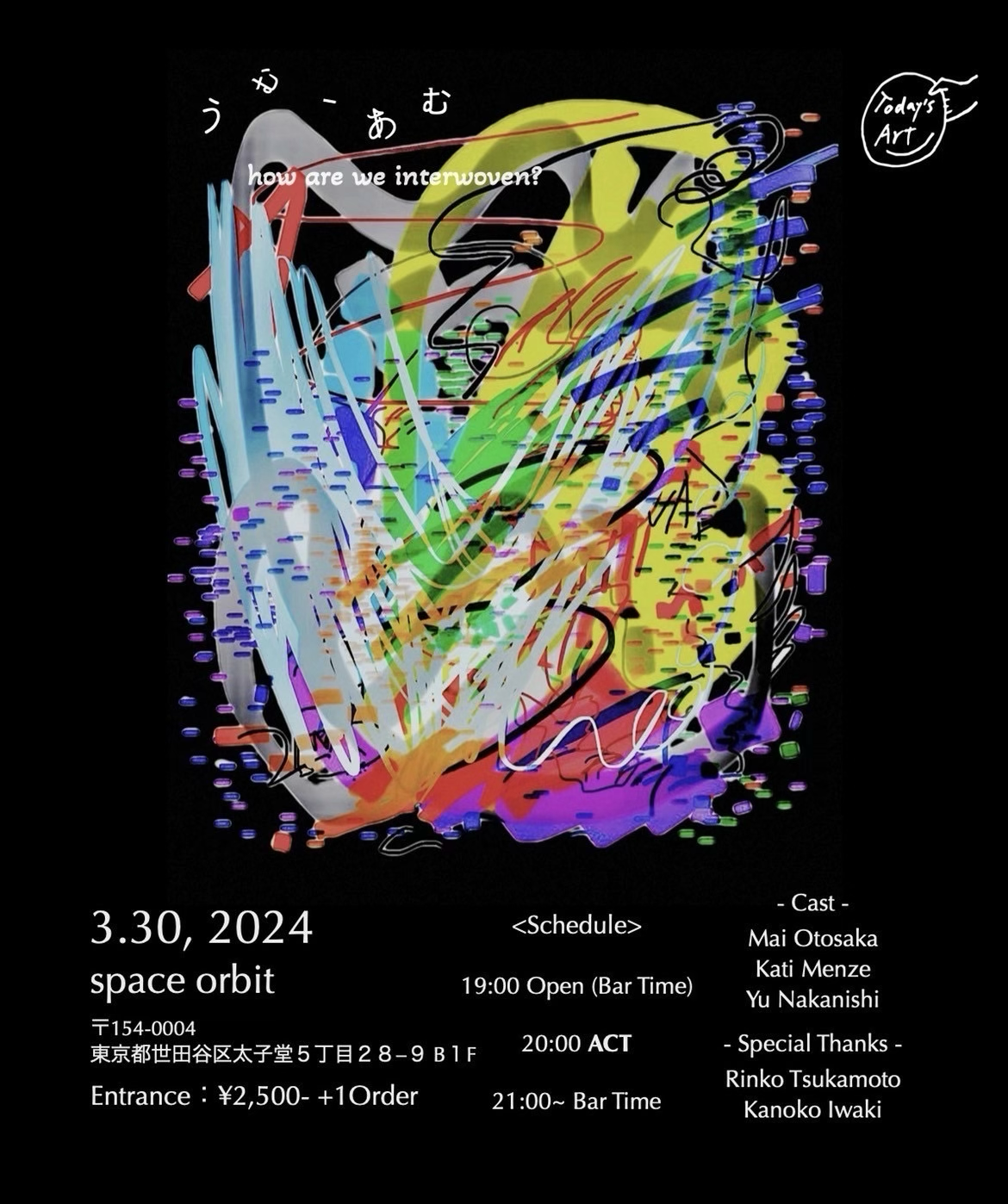 Today’s Artというグループを高校の友人たちと結成。Today’s Artとして初めてとなるこの公演は、ダンスや音楽を使って、パフォーマー3人が空間や観客を編んで、織り交ぜながらひとつのアートを生み出す。土曜の夜にリラックスした時間を観客と一緒に楽しむ。