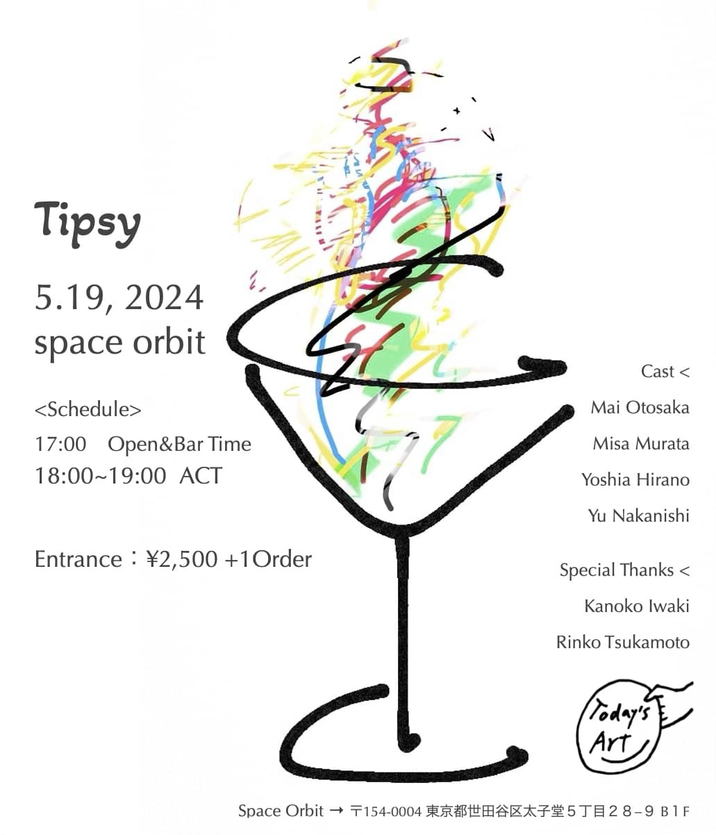 「Tipsy 」はToday's Artとして2回目の公演。タイトルのTipsy (ティプシー)は🍸「ほろ酔い」や「少し酔った」という意味がある。ダンスや歌、演奏に酔いしれるような気持ちの良い、心地よい空間を観客と一緒に創り上げていく。